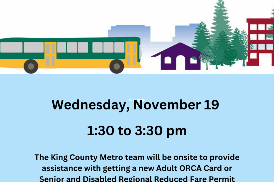 The King County Metro team will be onsite to provide assistance with getting a new Adult ORCA Card or Senior and Disabled Regional Reduced Fare Permit (RRFP),… Read More »King County Metro Orca Pop-Up, Nov. 19, 2025