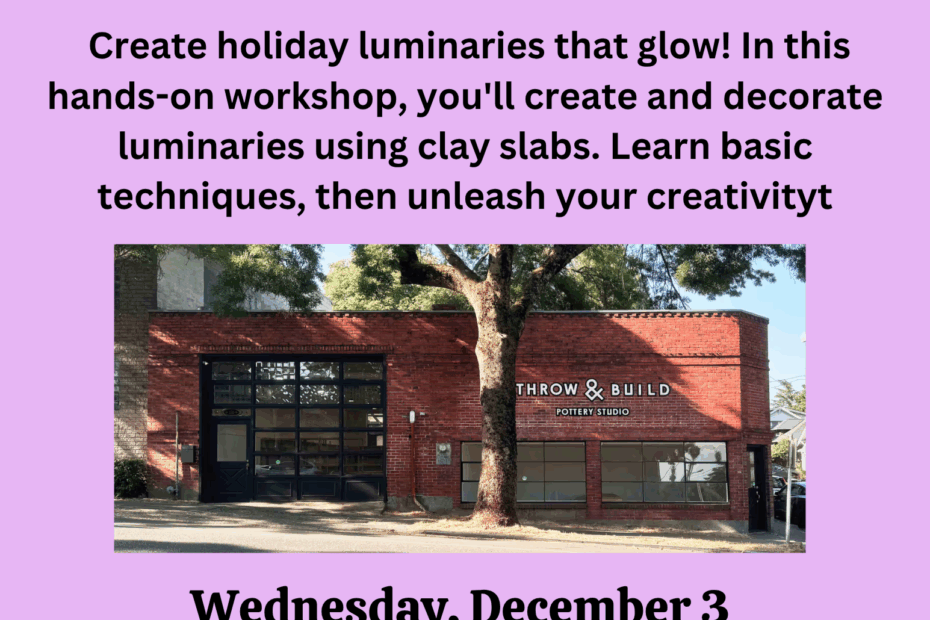 Join us for a workshop at Throw and Build Pottery Studio! Create holiday luminaries that glow! In this hands-on workshop, you’ll create and decorate luminaries… Read More »Throw and Build Workshop, Dec. 3, 2025