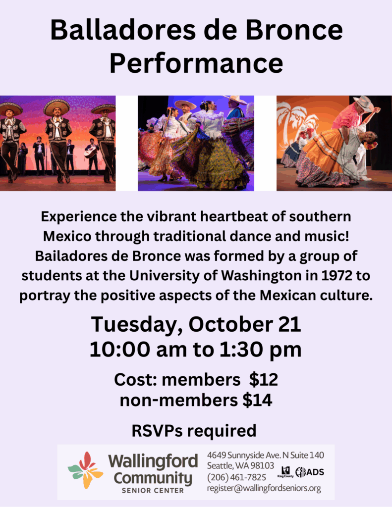 Experience the vibrant heartbeat of southern Mexico through a dynamic showcase of traditional dance and music! Bailadores de Bronce was formed by a group of students at the University of Washington in 1972 and portrays the positive aspects of the Mexican culture in the broader community, breaking down cultural barriers and building bridges within the community. RSVPs required, $12 for members, $14 for non-members.