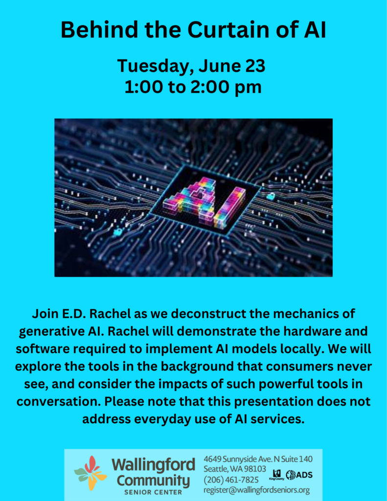Join E.D. Rachel as we demystify and deconstruct the mechanics of generative AI. Rachel will demonstrate the hardware and software required to implement AI models locally, right here at WCSC. We will explore the tools in the background that consumers never see, and consider the impacts of such powerful tools in conversation. Please note that this presentation does not address everyday use of AI services.