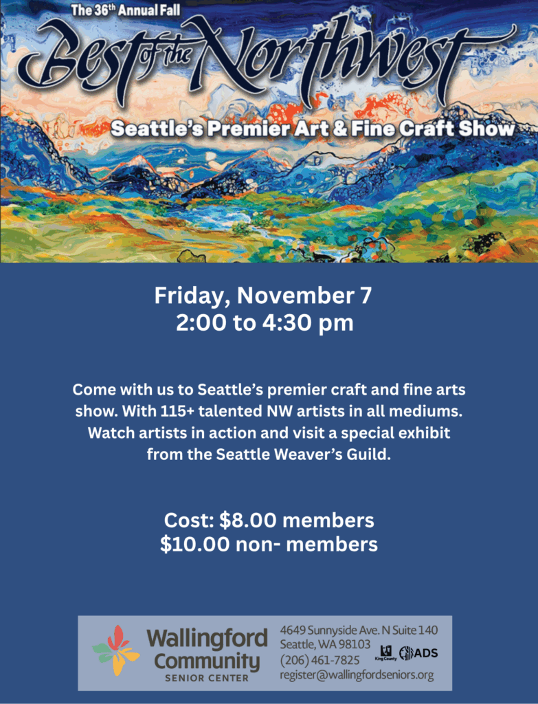 Come with us to the annual Best of the Northwest Fall Show, Seattle’s Premier Art & Fine Craft show! Enjoy seeing 115+ talented NW artists in all mediums, watch artists in action and see how the artwork is made, and find some exciting local treasures. RSVPs required. $8 for members, $10 for non-members. RSVPs required.