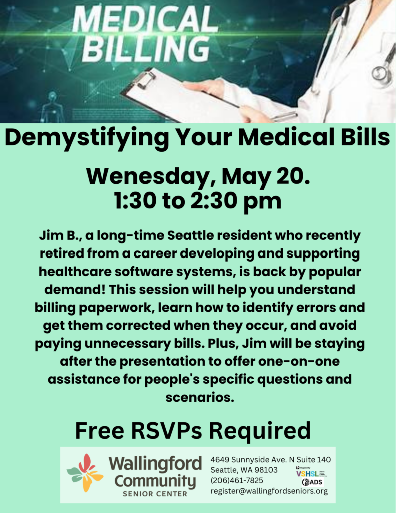 Jim B., a long-time Seattle resident who recently retired from a career developing and supporting healthcare software systems, is back by popular demand! This session will help you understand billing paperwork, learn how to identify errors and get them corrected when they occur, and avoid paying unnecessary bills. Plus, Jim will be staying after the presentation to offer one-on-one assistance for people’s specific questions and scenarios. FREE, RSVPs appreciated
