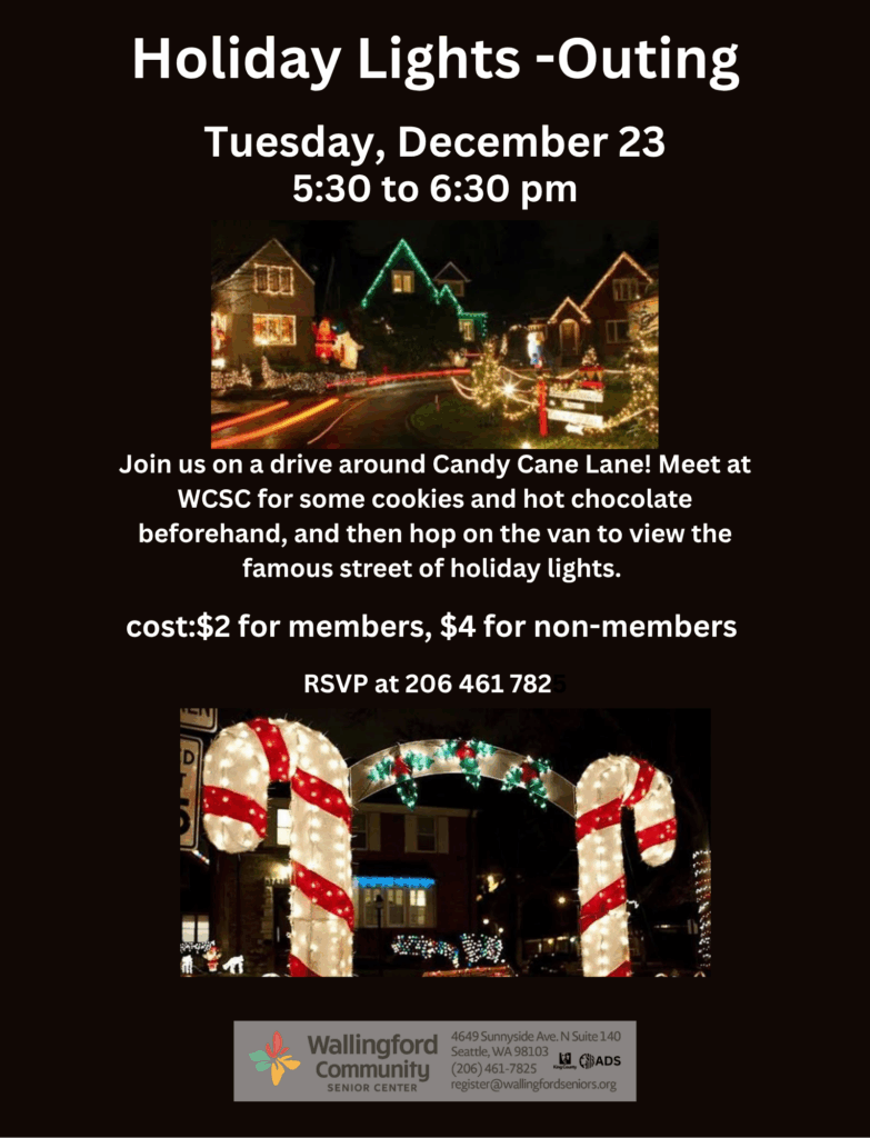 Join us on a drive around Candy Cane Lane! Meet at WCSC for some cookies and hot chocolate beforehand, and then hop on the van to view the famous street of holiday lights. $2 for members, $4 for non-members