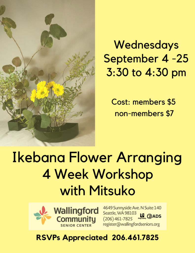 After her fun spring Ikebana Flower Arrangement presentation, Mitsuko is back for a 4-week workshop! Work along with her as you learn how to create your own unique arrangements based on the ancient art of Japanese flower arrangement. No experience necessary! Bring in your own assortment of flowers and plants to work with, supplemented by some donated flowers from Lavassar Florists, and we will have vases available if you don’t want to bring your own. Mitsuko has been practicing Ikebana for over 50 years and has participated in many exhibitions, flower & garden shows, Ikebana international exhibitions, and more. $5 for members, $7 for non-members, RSVPs are appreciated.