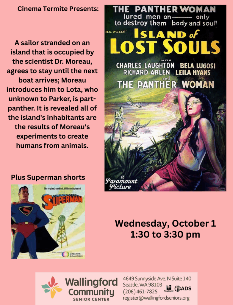 A sailor who finds himself stranded on an island that is occupied by the scientist Dr. Moreau (Laughton). Parker agrees to stay until the next boat arrives; Moreau introduces him to Lota (Burke), who unknown to Parker, is part-panther. It is revealed all of the island’s inhabitants are the results of Moreau’s experiments to create humans from animals. Will be shown along with superman shorts.