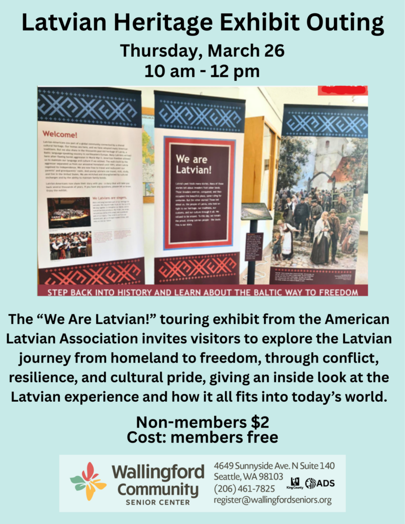 Join us for a trip to explore the “We Are Latvian!” exhibit at the Seattle Latvian Center. This touring exhibit from the American Latvian Association invites visitors to explore the Latvian journey from homeland to freedom, through conflict, resilience, and cultural pride, giving an inside look at the Latvian experience and how it all fits into today’s world. Free for members, $2 for non-members. RSVPs required.