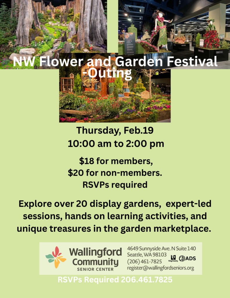 Join us for an outing to the 2026 Northwest Flower and Garden Festival! Explore over 20 display gardens, various expert-led sessions and hands on learning activities, and thousands of unique treasures in the garden marketplace. This annual event is perfect for sparking creativity and gathering ideas for beautiful, thriving living spaces. $18 for members, $20 for non-members. RSVPs required.