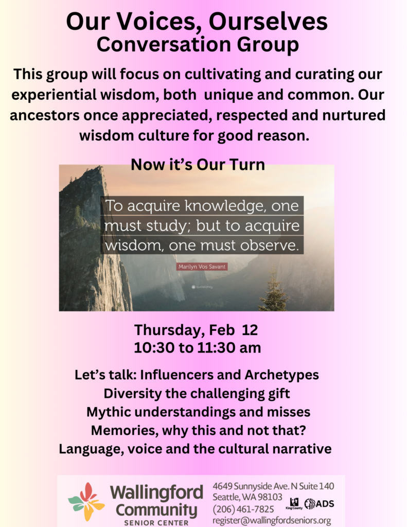 This group will focus on cultivating and curating our experiential wisdom, both unique and common. Our ancestors once appreciated, respected and nurtured wisdom culture for good reason. Now it’s our turn. Let’s talk about influencers and archetypes, the challenging gift of diversity and why we remember events in differing ways. Consider how and why language, voice and the cultural narrative impact perceptions and more! This group will repeat monthly.