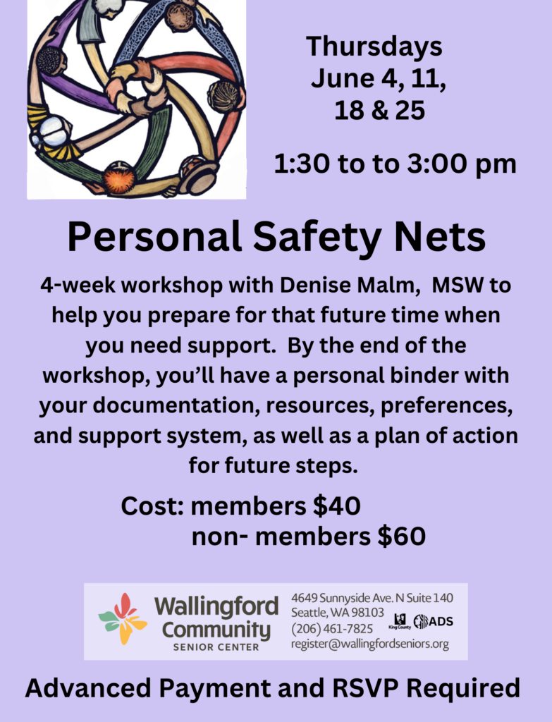 Join a supportive group to take steps toward putting together YOUR Personal Safety Net. This 4-week workshop with Denise Malm MSW, Social Worker will help you prepare for that inevitable time in the future when you need support. Don’t wait until after you need it! By the end of the workshop, you’ll have a personal binder with your documentation, resources, preferences, and support system all in one place, as well as a plan of action for future steps. The workshop is limited to 12 participants; we will collect a waitlist for a future workshop. RSVPs required Members $40.00, non-members $60.00