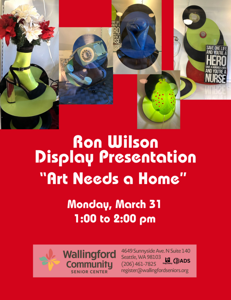 Join us to view the unique art works of one of our members, Ron Wilson, who uses found and second hand items to create  one of a kind art pieces.  He will give a presentation with time  for questions and discussion. This is a free event. Come early and enjoy a lunch of meatballs, vegetables, salad and dessert. Members $5.00, non-members $7.00