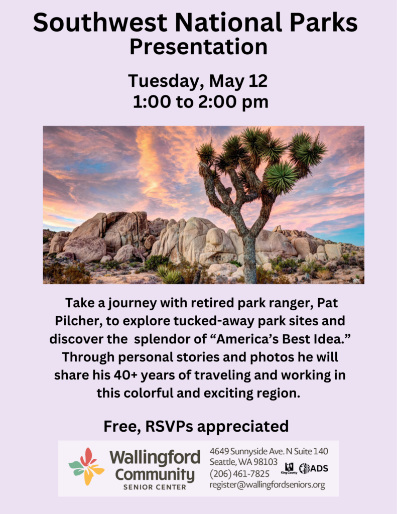 Southwest National Park Sites: America’s Hidden Gems. Take a journey with retired park ranger, Pat Pilcher, to explore tucked-away park sites and discover the variety and splendor of “America’s Best Idea.” Through personal stories and photos he will share his 40+ years of traveling and working in this colorful and exciting region. Free, RSVPs appreciated!