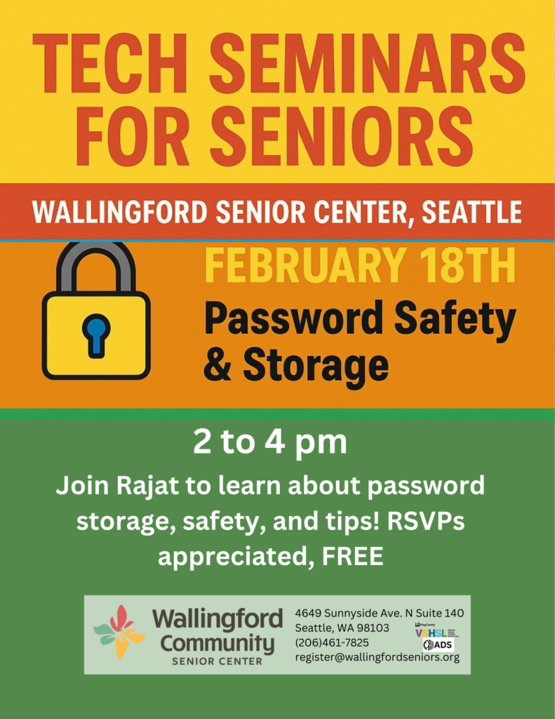 Tech Workshop -Password Storage and Safety, Feb. 18, 2026 Join Rajat to learn about password storage, safety, and tips! RSVPs appreciated, FREE