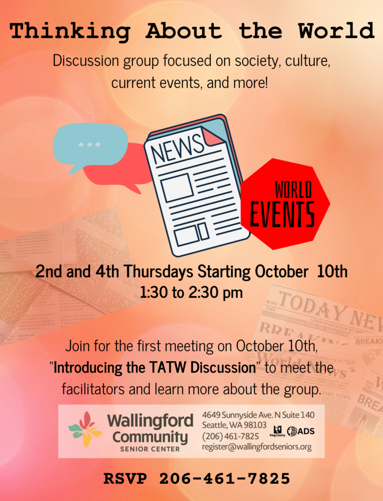 Thinking About the World (TATW) is a discussion group that captures semi-current events in a package of written material, which becomes the basis of a one-hour facilitated discussion. The reading materials consist of printed and posted articles and essays drawn from a variety of sources, including The Seattle Times, New York Times, Washington Post, New Yorker, and more. Explore important aspects of our society and culture with a focus on politics, science, technology, and other interesting and relevant subjects. Join us for the first meeting on October 10th, “Introducing the TATW Discussion” to meet the facilitators and learn more about the group and the possible discussion topics. FREE, RSVPs appreciated.