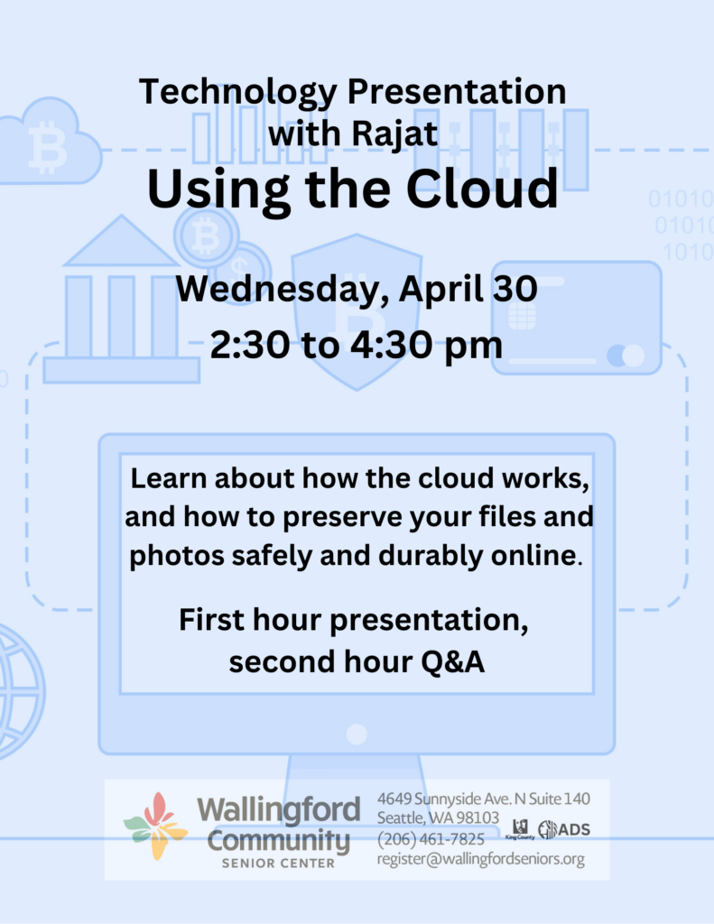 Rajat is back to help you learn about the cloud! Learn about how the cloud works, and how to preserve your files and photos safely and durably online. 1st hour will be the presentation, and the 2nd hour Rajat will be going around for one-on-one help. Free, RSVPs appreciated!