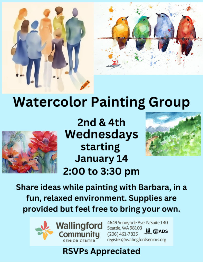 Join Barbara every 2nd and 4th Wednesday to explore the art of watercolor painting with other artists of all levels- no experience necessary! Share ideas and create beautiful artwork in a fun, relaxed environment. Supplies are provided but feel free to bring your own. RSVPs appreciated